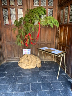 Pour le dimanche 5 avril, dimanche des Rameaux une grande branche de sapin traversée par un ruban rouge avec un panneau « Vive Jésus » « Hosanna » était dressée dans le porche. Sur une table des feuilles A4 avec « Hosanna » étaient disponibles afin d’être affichées à la fenêtre chez soi. Comme le peuple de Jérusalem, nous avions l’occasion d’extérioriser notre joie, d’accueillir notre libérateur. « Les foules marchaient devant Jésus et celles qui suivaient criaient : Hosanna au fils de David » (Mt. 21, 9).