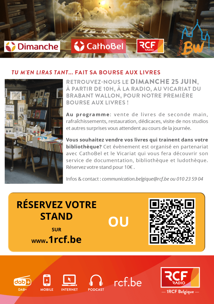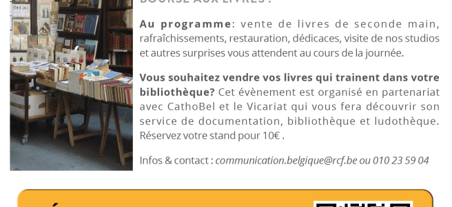 Au programme : achat et vente de livres de seconde main, petite restauration, découverte de la bibliothèque du Vicariat du Brabant wallon, des studios de RCF, et bien d’autres surprises ….