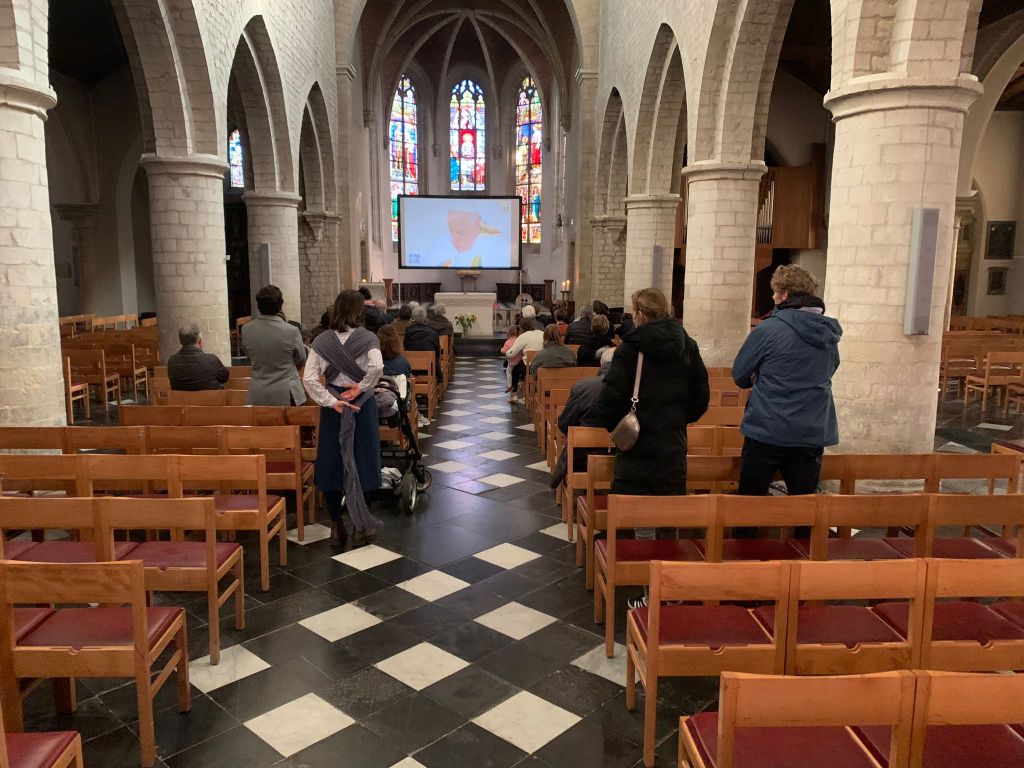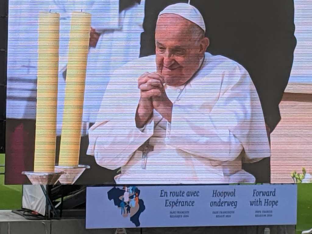 à la messe télévisée du Pape, projetée sur grand écran dans l’église.