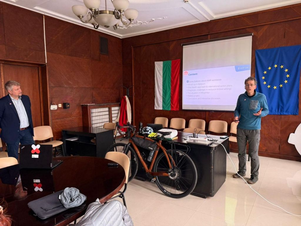 Pour la conférence de Sofia, nos hôtes étaient le Centre national des maladies infectieuses et parasitaires, l’Association « One Health », l’Association bulgare des professionnels des soins de santé, la Faculté de médecine de Sofia et l’Union vétérinaire bulgare. Etaient présents la professeure Emma Kyoleyan, le Dr Dragomir Ivanov et Spasena Ilieva du conseil d’administration de l’association « One Health», le Dr Ivan Ivanov, chef du laboratoire national de référence, Tatiana Slavkova et Rayna Boyadjieva du conseil d’administration de l’Association bulgare des professionnels des soins de santé, ainsi que d’autres représentants de différentes institutions. La conférence a suscité des discussions très intéressantes, nos interlocuteurs étaient très enthousiastes et nous ont fait part du fait qu’ils venaient de publier en janvier dernier le plan national de lutte contre l’antibiorésistance. Tous ces échanges en route permettent de faire évoluer cette conférence et d’affiner/adapter les messages à transmettre dans les pays qui seront traversés par la suite. En annexe quelques photos. Dans le post suivant quelques articles de presse et l’explication du symbole de lutte contre l’antibiorésistance 😉 Demain en route vers le nord…pour d’autres aventures !