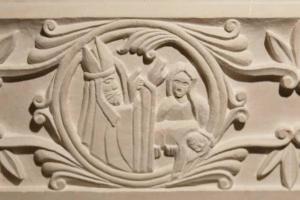 Le deuxième médaillon : on y voit Nicolas bénir une femme qui tient quelqu’un d’inerte dans ses bras. Un jour une femme s’en était allée, en toute hâte, à l’église pour savoir ce qu’il en était de la rumeur selon laquelle Nicolas avait été choisi comme évêque. De retour chez elle, elle trouva son enfant, qui s’était trop approché du feu, couvert de brûlures. Elle l’apporte à Nicolas, il bénit l’enfant et il fut guéri. Ainsi nous voyons par cette histoire que Nicolas est celui qui crée un climat où les enfants peuvent recouvrer la santé.