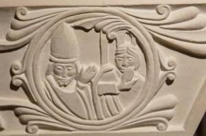 Le quatrième médaillon : on y voit Nicolas qui détourne la tête de quelqu’un qui s’avère être Arius. Arius était opposé à l’idée de la divinité de Jésus. Nicolas va combattre cette hérésie arienne. Le combat contre cette hérésie va déboucher sur le crédo de Nicée. Nicolas est un fervent défenseur de la divinité de Jésus.