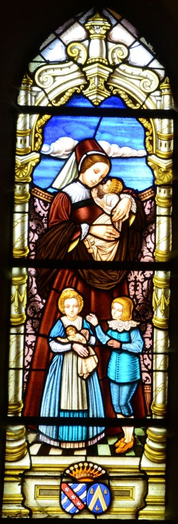 Le vitrail de gauche nous montre sainte Jeanne de Chantal avec un enfant dans ses bras ainsi que deux autres devant elle, un garçon et une fille, cette dernière tenant une poupée. Le décor de colonnes entourant le personnage principal est identique au vitrail voisin.