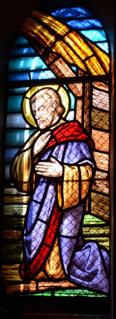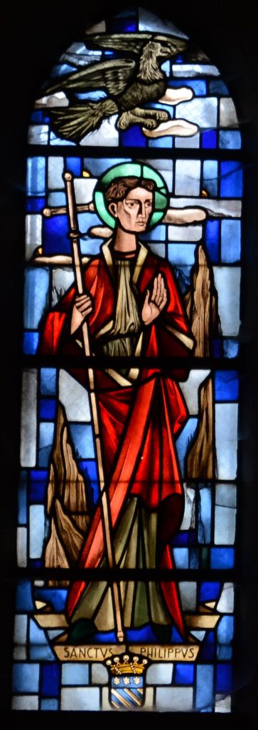 A ses côtés, d’une facture beaucoup plus moderne de par ses formes anguleuses (et bien que contemporaine du précédent) nous découvrons, comme mentionné au bas du vitrail, saint Philippe.