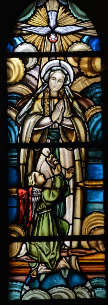 Le vitrail de gauche représente la sainte Vierge vêtue de son traditionnel manteau bleu. On peut y lire en tout petit et au bas de l’image « 1230 Fondation de cette église par Henri Ier duc de Brabant ».