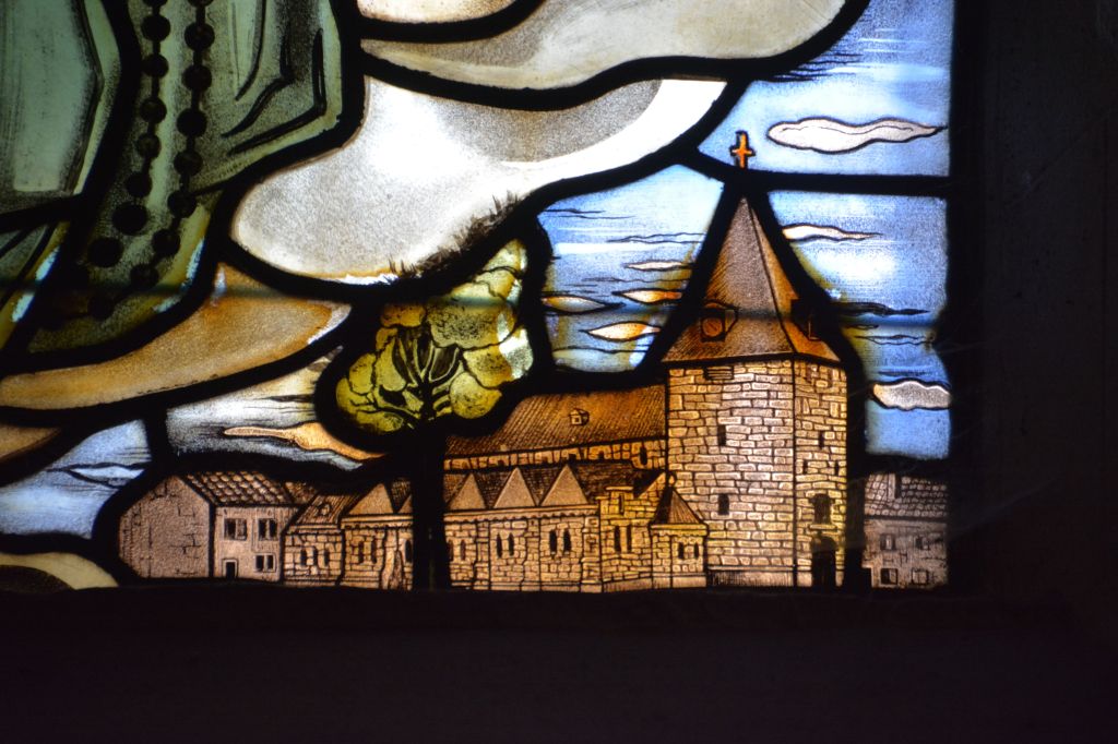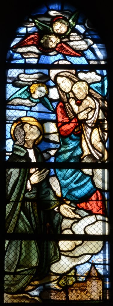 Louis-Marie Grignon de Montfort a été canonisé le 20 juillet 1947. De tous les saints représentés dans les vitraux de l’église, c’est celui dont la canonisation est la plus récente. Ce vitrail présente une caractéristique si pas unique certainement très rare: l’église qui le contient est illustrée dans le coin inférieur droit. On peut en effet reconnaître sans aucune hésitation l’église Saint-Nicolas de La Hulpe ainsi que plusieurs maisons de la place. Je suis convaincu que la plupart des habitants de ces maisons ignorent que leur demeure est représentée dans l’église!