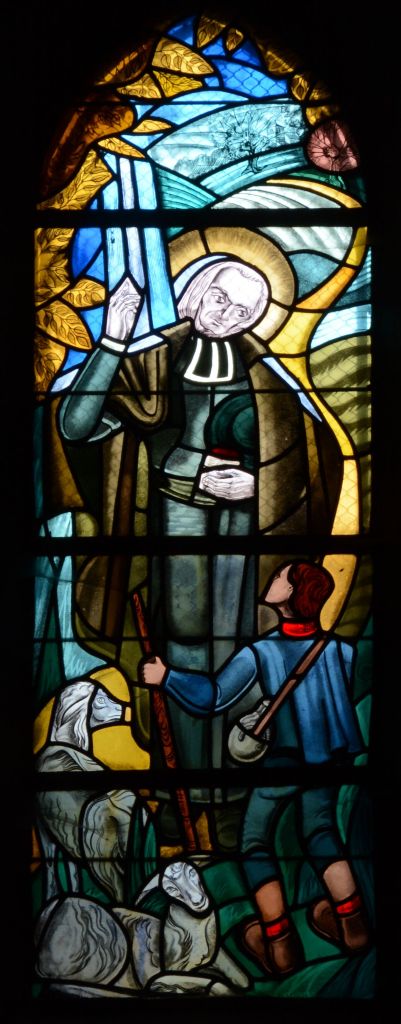 Le vitrail représente une scène bien connue de la vie du curé d’Ars.